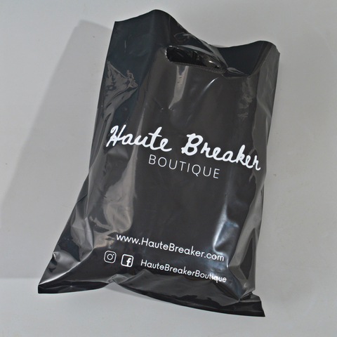 Custom 912 סחורה מבריק פלסטיק שקיות עם לוגו פולי תיק ידית שחור קניות לוגו מותאם אישית הקמעונאי פלסטיק שקיות עבור בגדים
